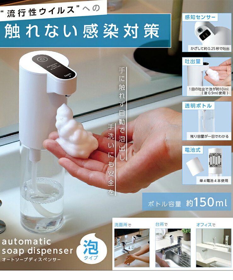 オートソープ ディスペンサー 本体容量150ml 自動感知 泡タイプ 電池式 感染予防 感知センサー 感染対策 ハンドソープ【送料無料】